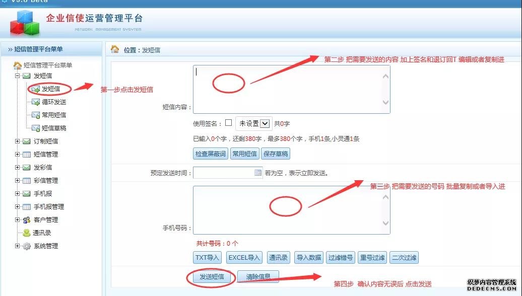 d、系統(tǒng)自動過濾當(dāng)前添加的號碼、去除錯號和重號。可多批次添加、導(dǎo)入號碼,請點擊“二次過濾”(如沒有進(jìn)行二次過濾,提交發(fā)送短信時系統(tǒng)會自動再次過濾去除重復(fù)號碼)。
