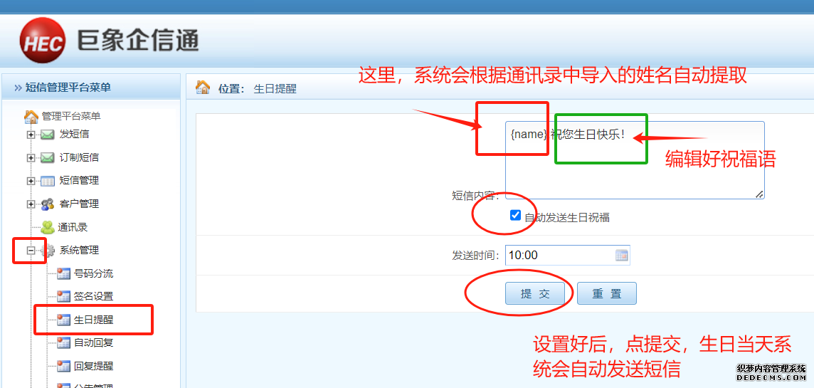 3、自動定時給員工、客戶發(fā)生日祝福短信操作 首先點擊左側(cè)導航條的通訊錄,導入含有生日日期的資料,然后點擊系統(tǒng)管理下的生日提醒,如下圖所示輸入生日祝福語后點提交即可;到生日當天系統(tǒng)會自動發(fā)送生日祝福短信。