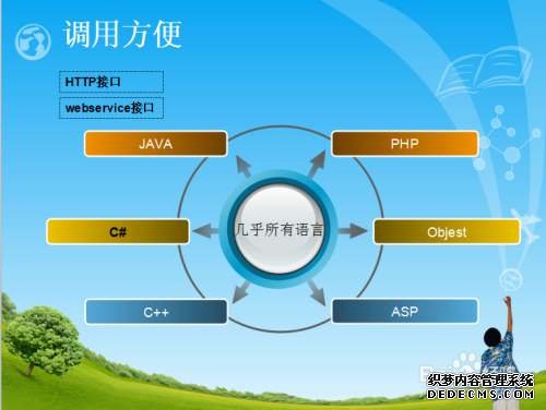 API接口: API接口的實(shí)現(xiàn)使用了WebService的方式,用戶通過(guò)調(diào)用WebService的指定接口函數(shù)以達(dá)到發(fā)送短信的目的,這樣也是快速接入的一種方法,并且提供主流開(kāi)發(fā)語(yǔ)言的DEMO,方便開(kāi)發(fā)者快速接入。