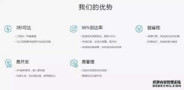 4、三網(wǎng)合一通道手機(jī)驗證碼短信接口 顯示號碼1069,是國內(nèi)中小型企業(yè)選擇很多的一種短信驗證碼接口,支持移動、電信、聯(lián)通三網(wǎng)用戶,實現(xiàn)全國全網(wǎng)覆蓋,只不過申請的門檻較高,一般需要有一千萬以上注冊資金的正規(guī)企業(yè)才可以向工信部門申請,因而此類供應(yīng)商的專業(yè)性及可靠性也是非常高的。